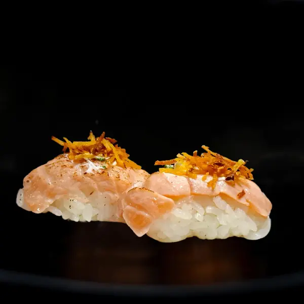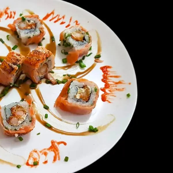 Arroz, cream cheese, camarão empanado, cebolinha e manta de salmão por cima selada - Atenção: não acompanha molho.