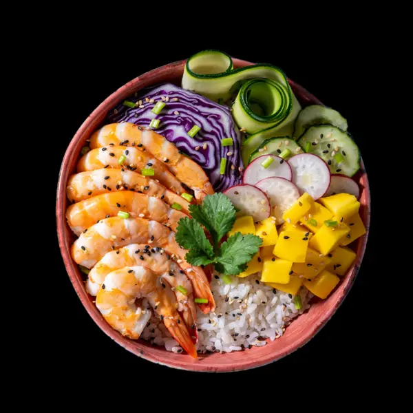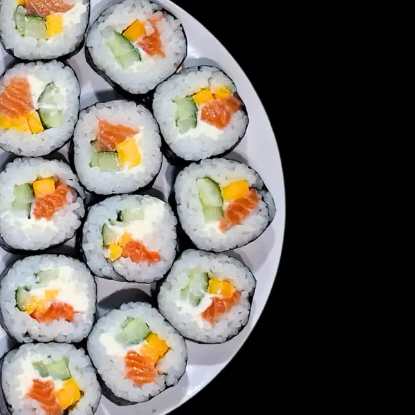 Arroz, salmão, manga e pepino - Atenção: não acompanha molhos.