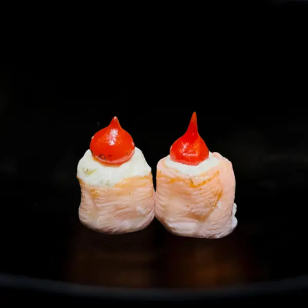 Salmão selado recheado com arroz e cream cheese e pimenta biquinho por cima - Atenção: não acompanha molho.