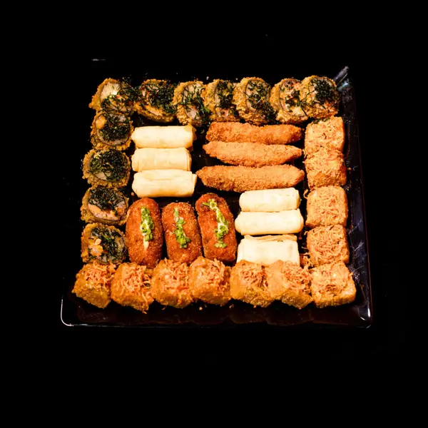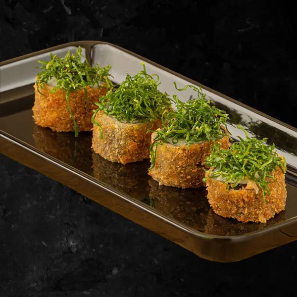 Folha de massa crocante c/ arroz e patê de salmão, empanado e frito - Atenção: não acompanha molho.