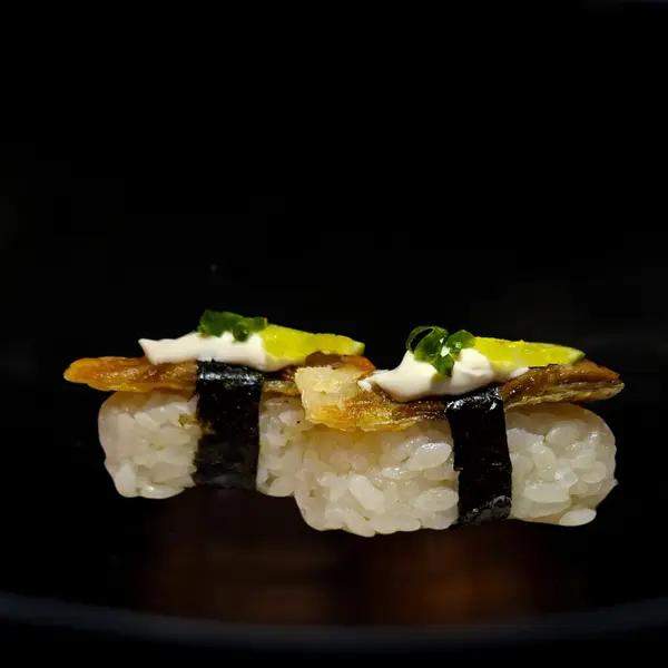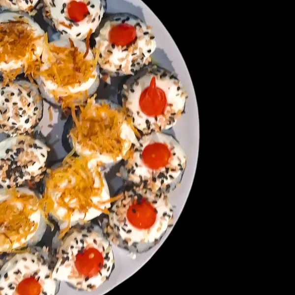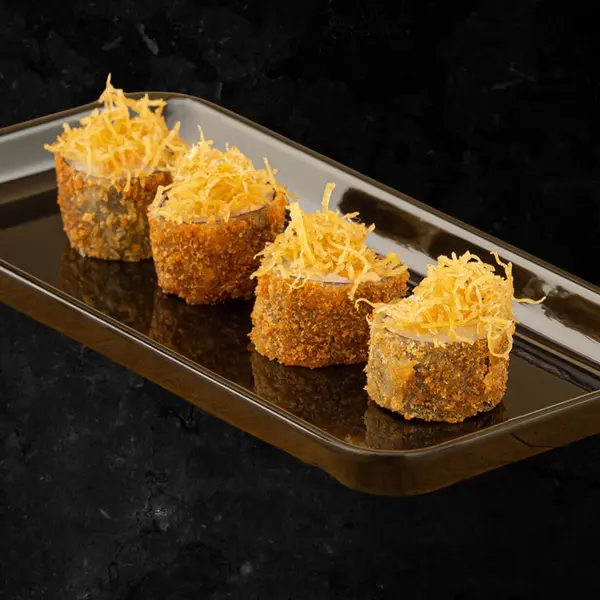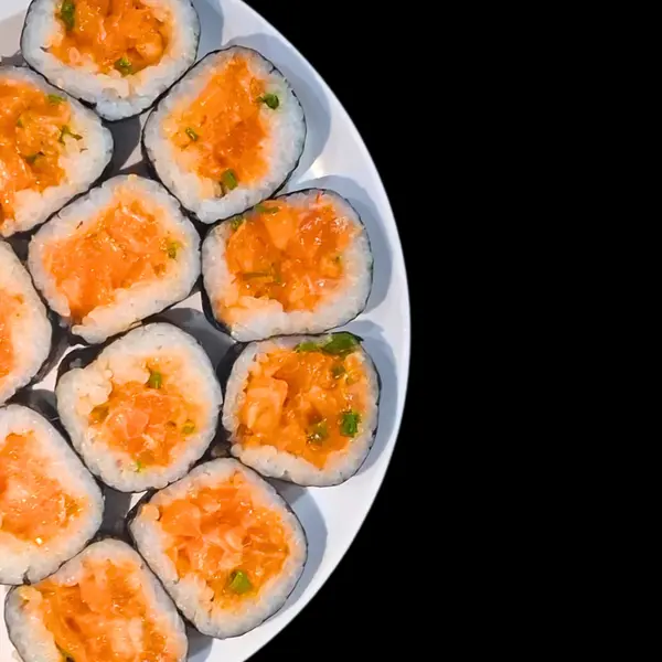 Sushis de porte pequeno com crispy - ATENÇÃO: o crispy vai variado conforme preparado do dia. Podendo ser crispy de pimenta biquinho; couve frita; cebolinha cristal; ceroura frita ou alho poró. - Atenção: não acompanha molho.