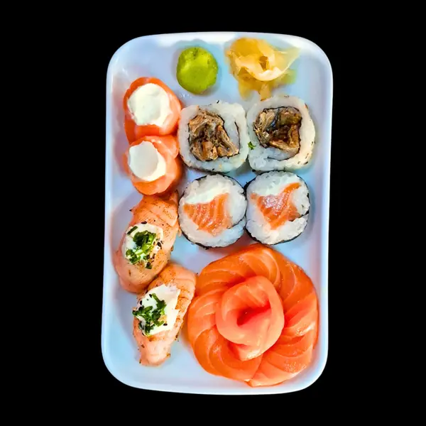 Este item acompanha 1 molho teriyaki/ tarê (30ml),1 molho shoyo (30ml) e 1 hashi. 6 sushis variados, 2 gunkans, 4 sashimis de salmão.