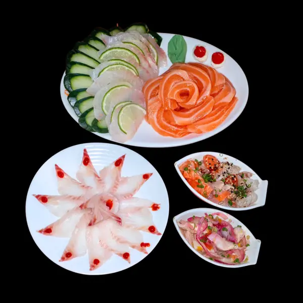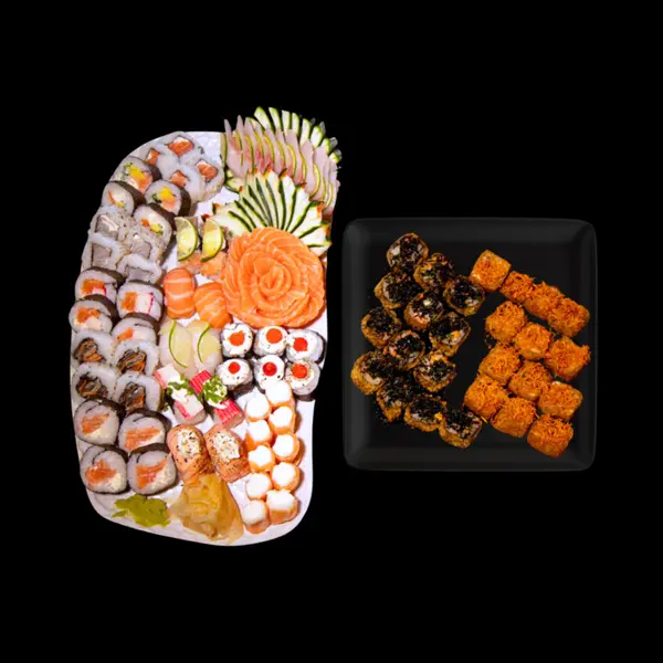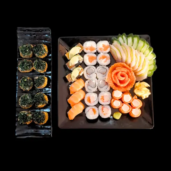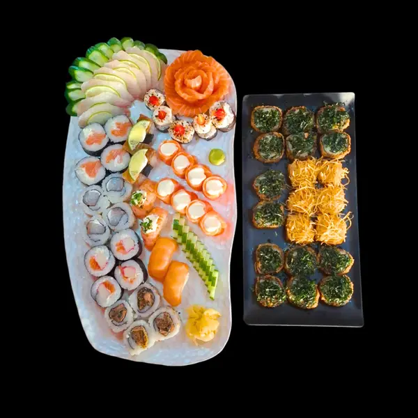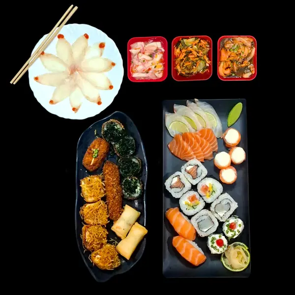 Este item acompanha 1 molho teriyaki/tarê (30ml), 1 molho shoyo (30ml), 1 caldo de limão (23ml) e 2 hashis. - 10 sushis variados, 8 sashimis (salmão/tilápia), 4 gunkans, 1 carpáccio (10 lâminas), 1 sunomono (100g), 1 tataki (100g), 1 ceviche (100g), 12 peças fritas variadas. - *OBS: não é possível retirar a cebola do ceviche.*