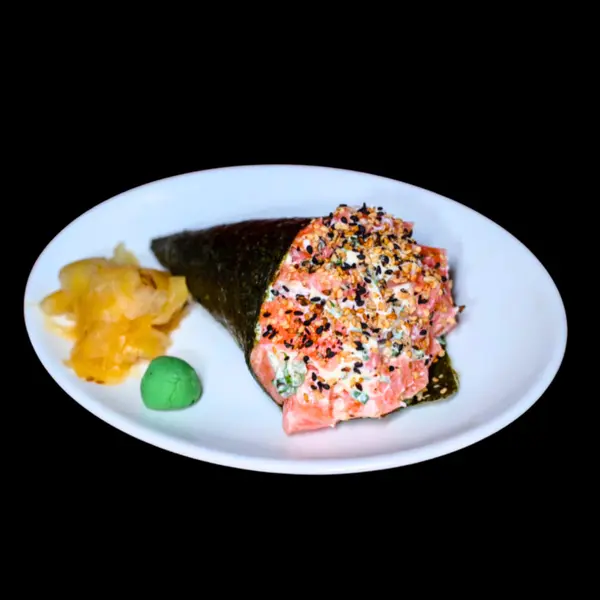 Temaki de patê de salmão, cebolinha, cubos de salmão empanados e fritos e pele de salmão grelhada - Atenção: não acompanha molho.