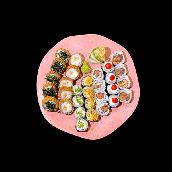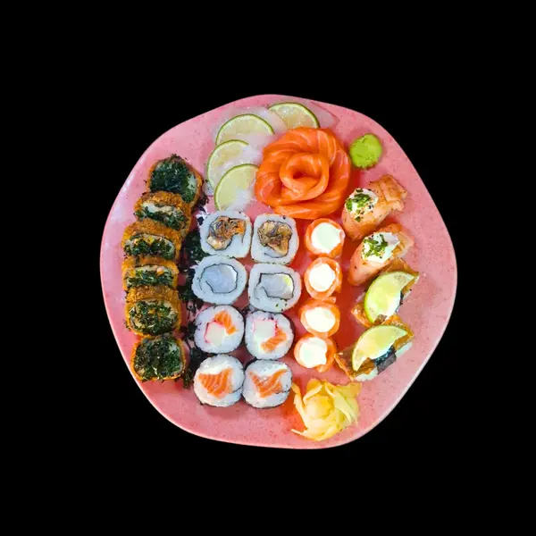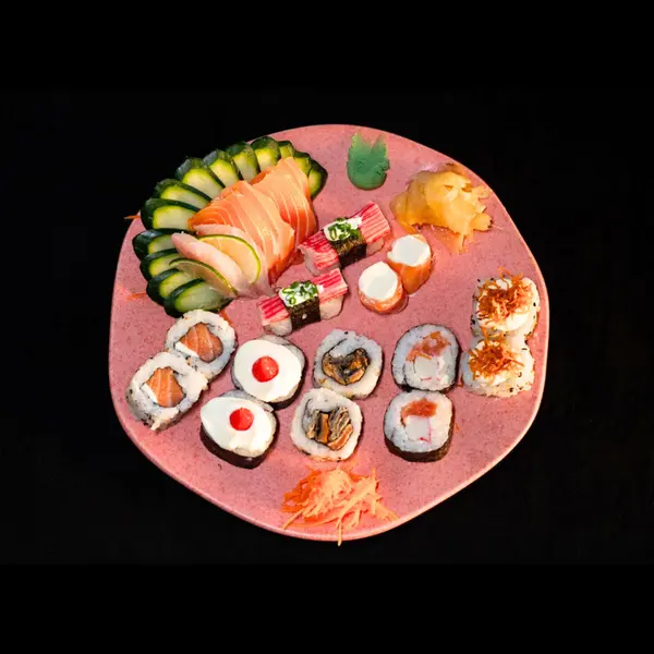Este item acompanha 1 molho teriyaki/tarê (30ml), 1 molho shoyo (30ml) e 2 hashis. 12 sushis variados, 4 gunkans, 8 sashimis (salmão/tilápia), 6 hots filadélfia.