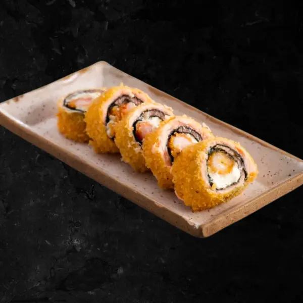 Salmão, camarão empanado e cream cheese. Empanado e frito - Atenção: não acompanha molho.