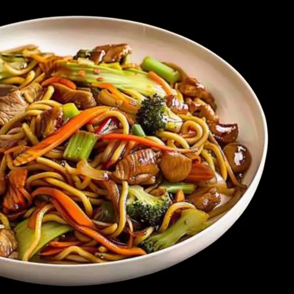 Macarrão chow mein, legumes, molho e a carne de sua preferência!
